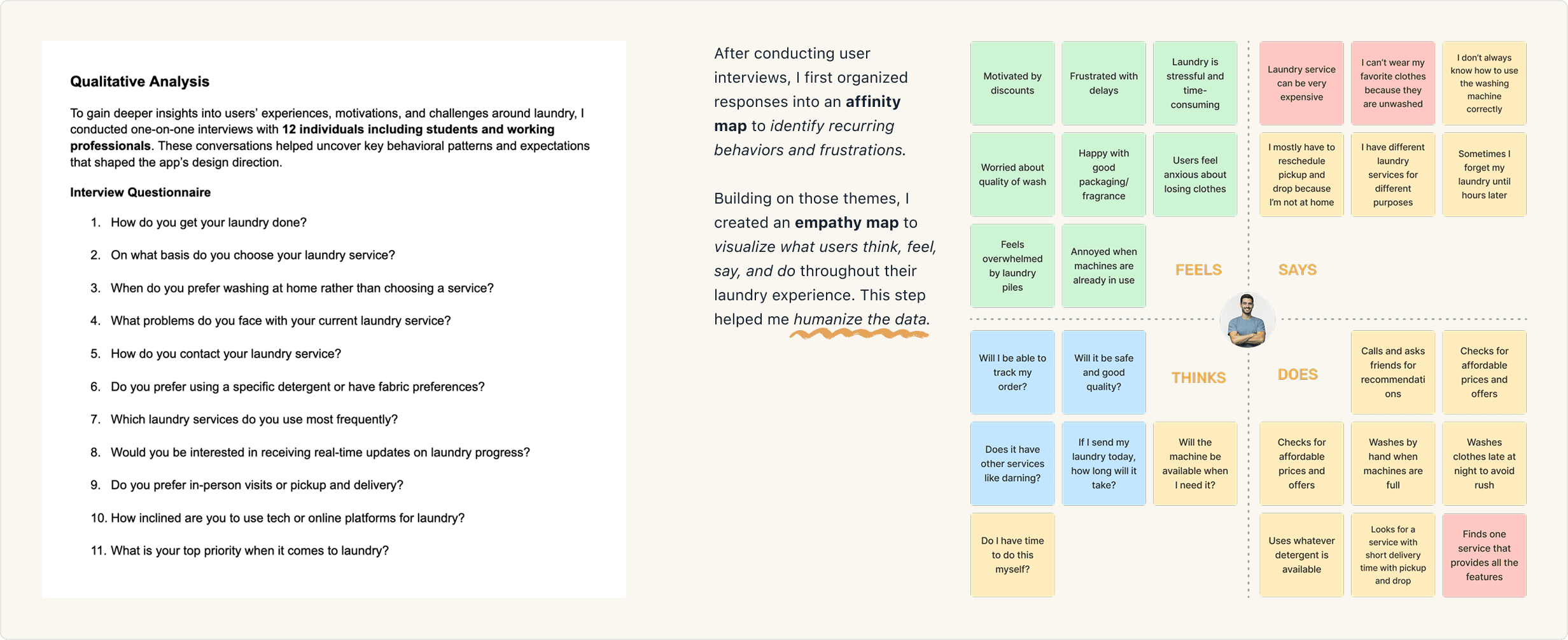 Explored emotions, decision factors, and expectations tied to laundry experiences.