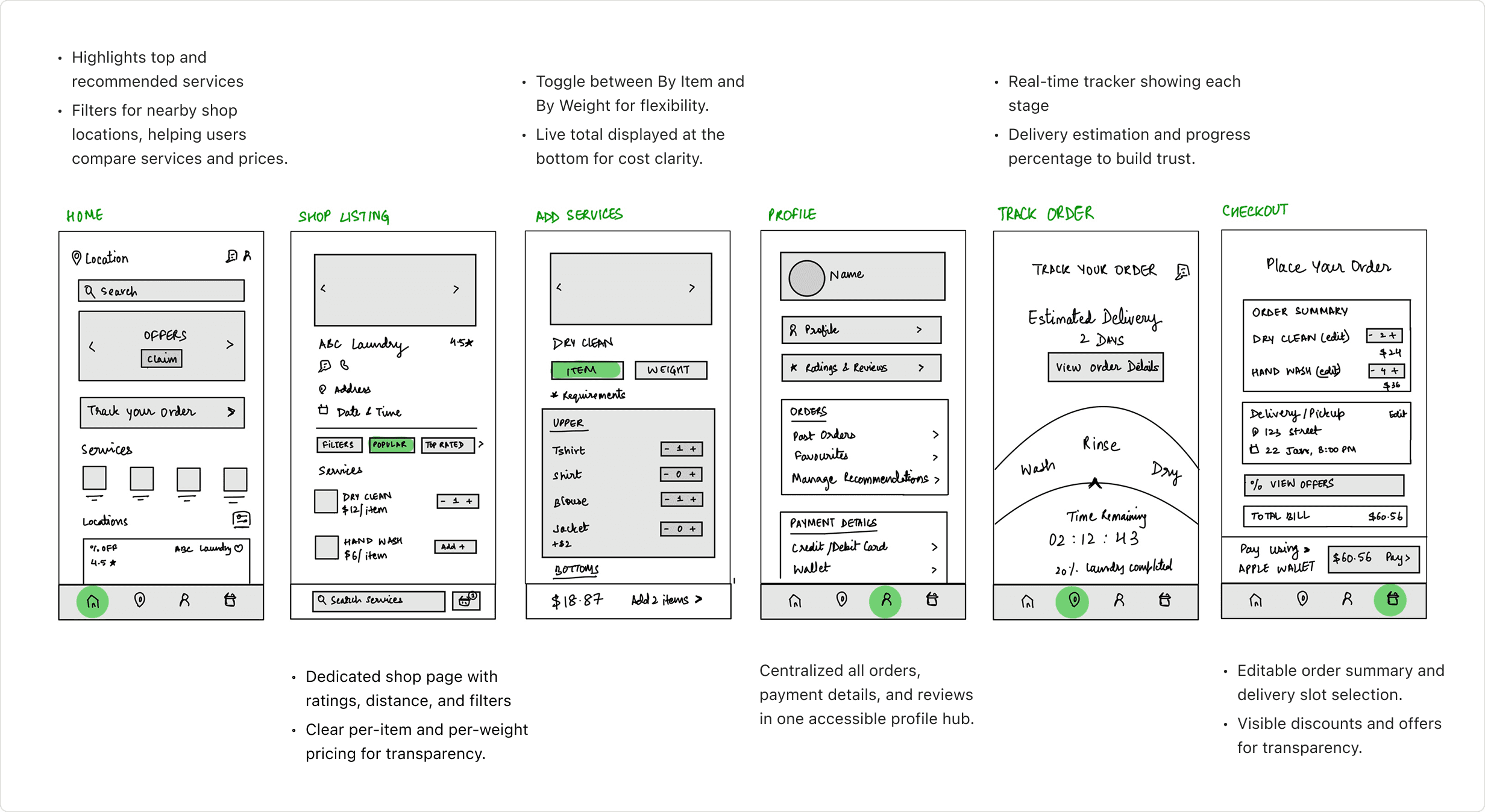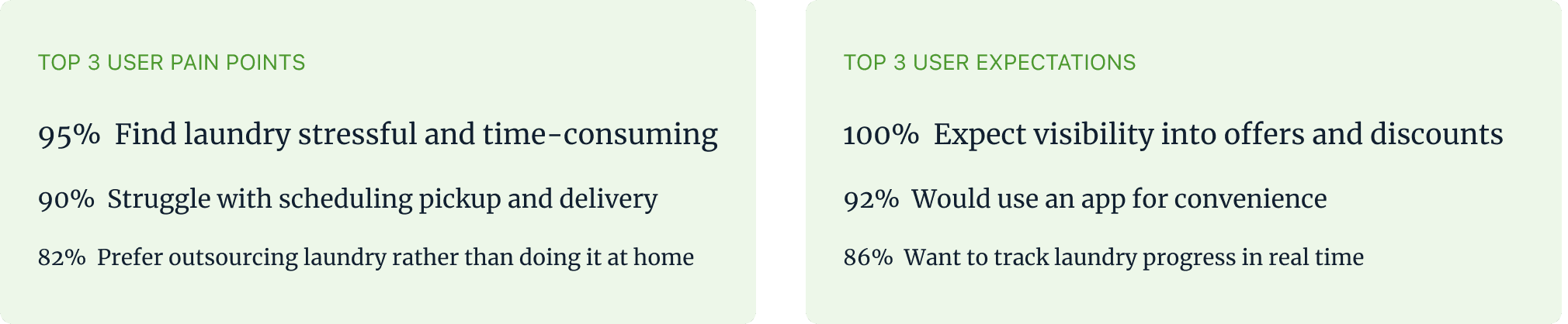 These personas helped me understand laundry from two sides, one user who wants control and assurance, and another who just wants things done quickly and right. Together, they shaped the foundation of my design decisions.