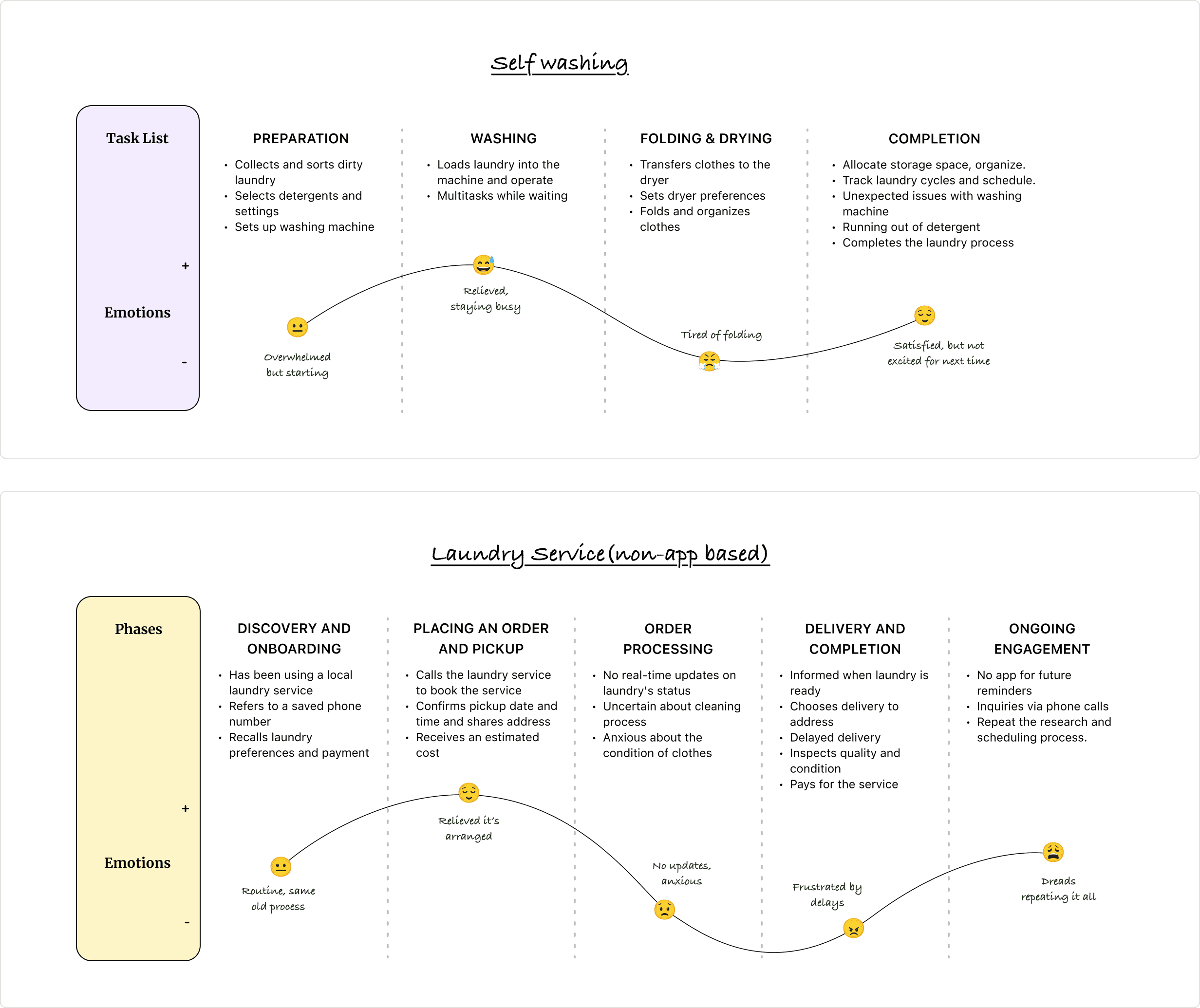 These journeys visualize how users move through their laundry tasks i.e. what keeps them going, what slows them down, and where frustration peaks. It helped me pinpoint opportunities to simplify steps and make the experience more reliable.