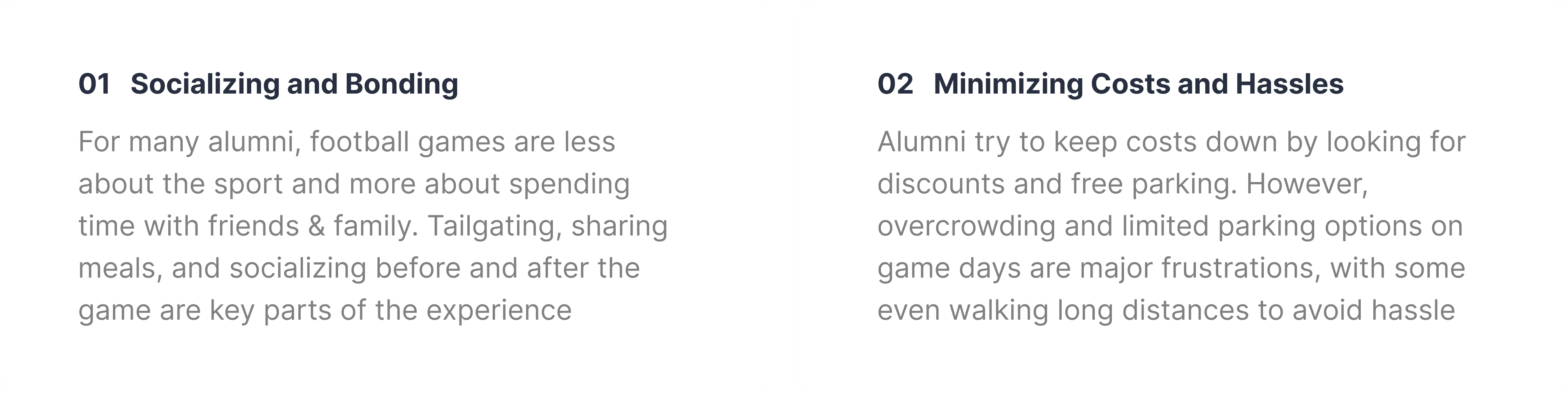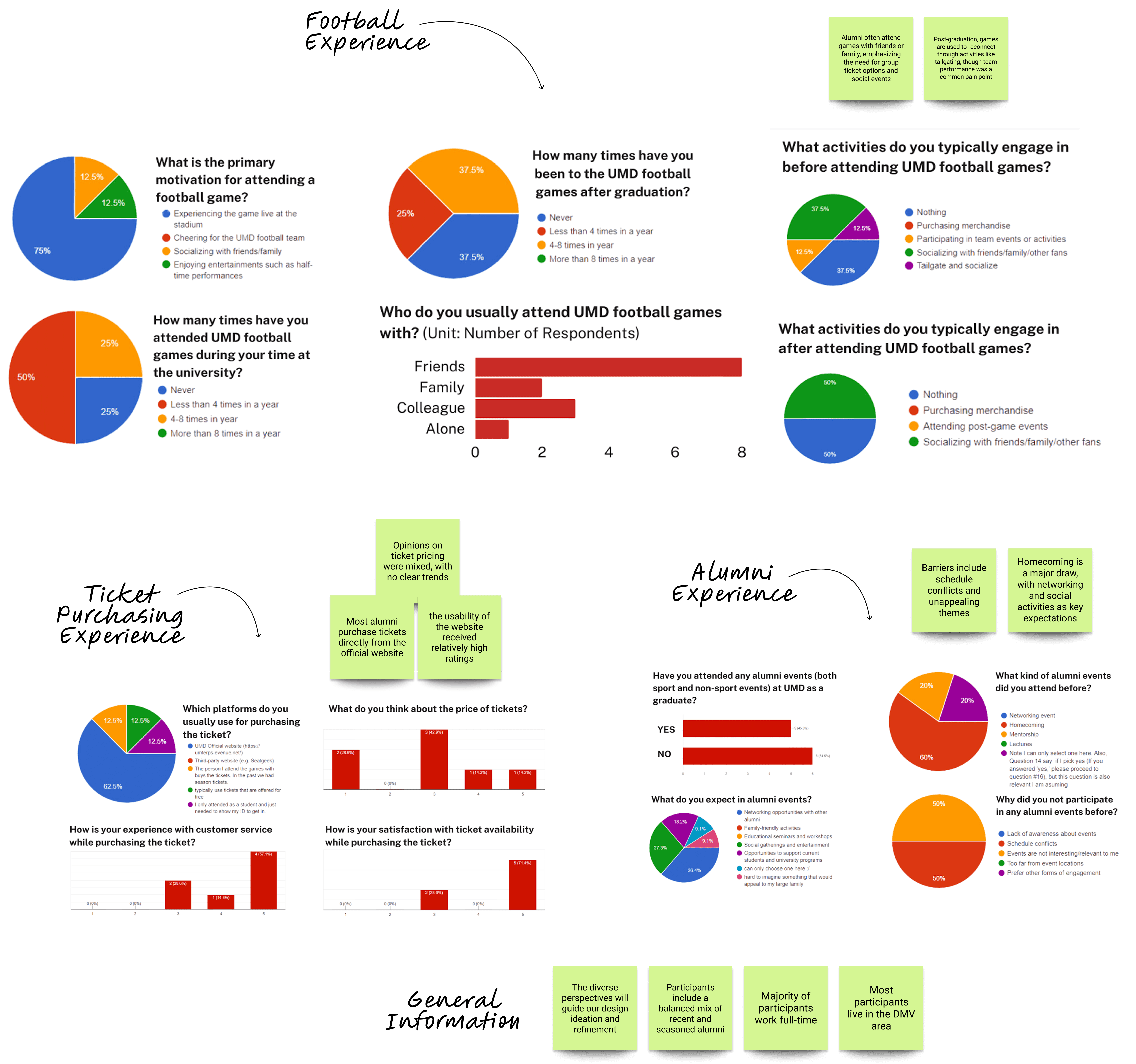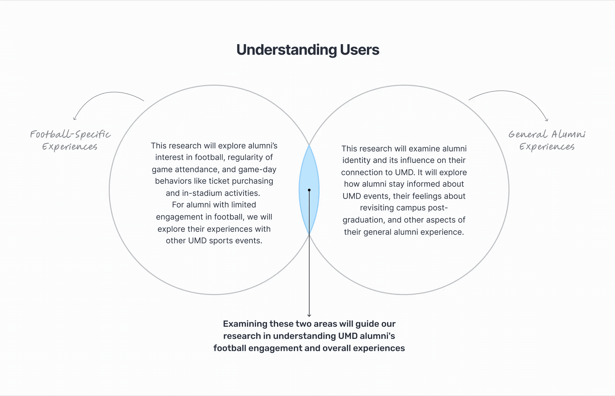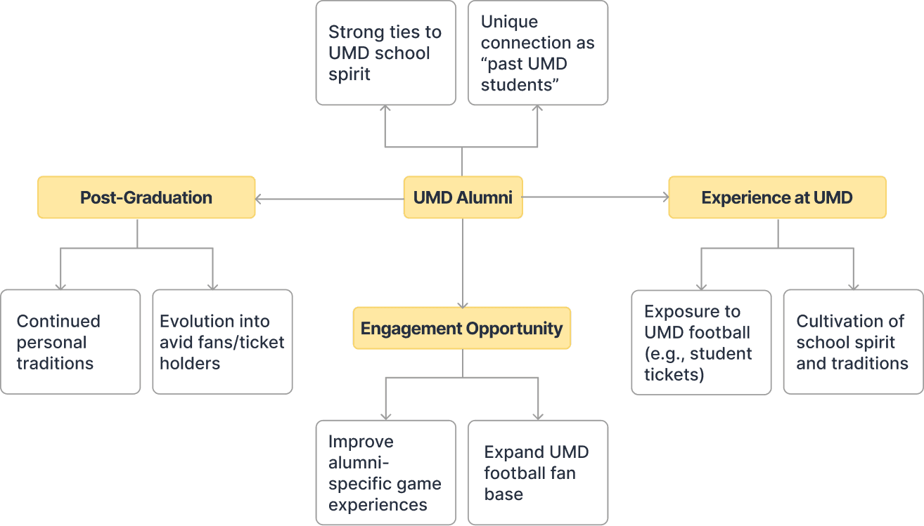 Based on contextual interviews with alumni and alumni coordinators, as well as surveys across alumni from various graduation years, our research revealed key insights into UMD alumni’s experiences attending football games. Our findings also provide transferable insights into broader needs, goals, and barriers of alumni, which we gained by exploring comprehensive alumni experiences beyond sporting events.