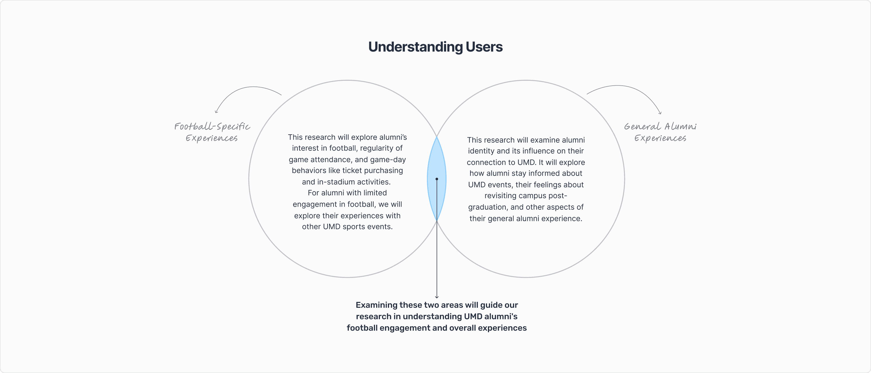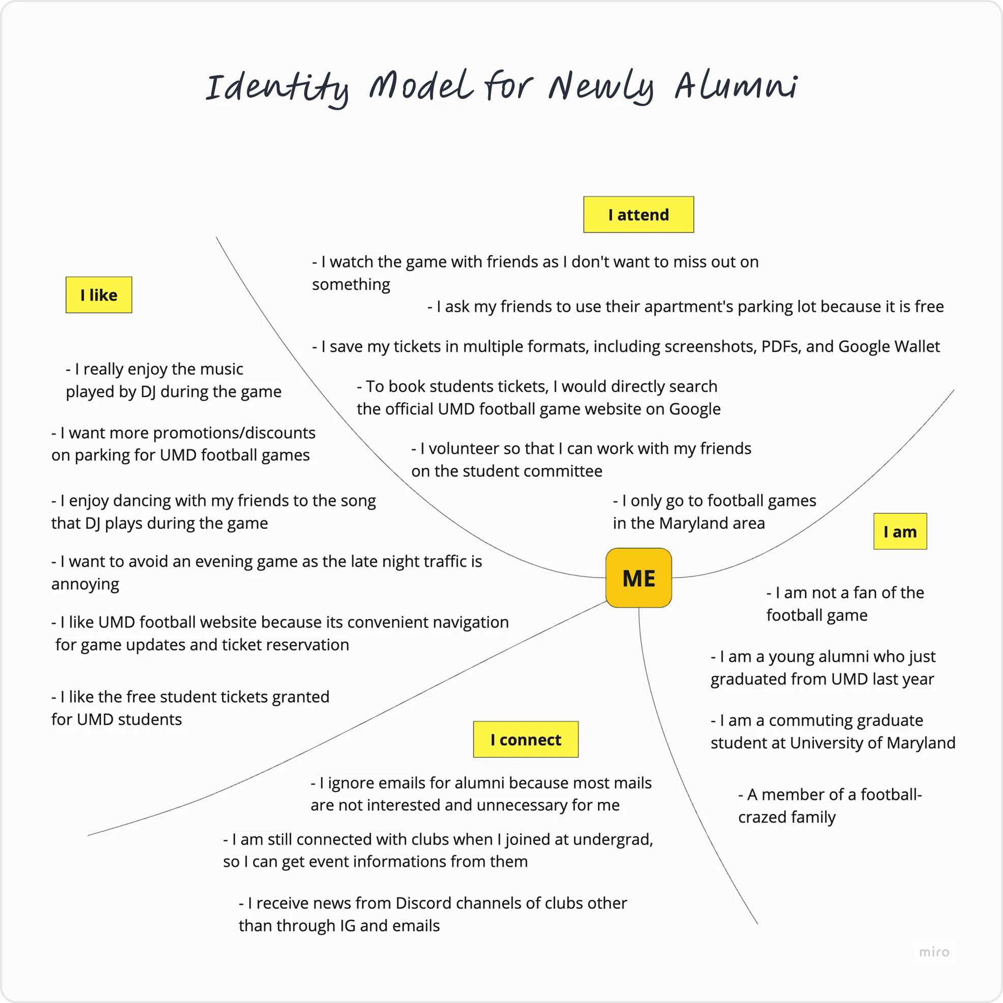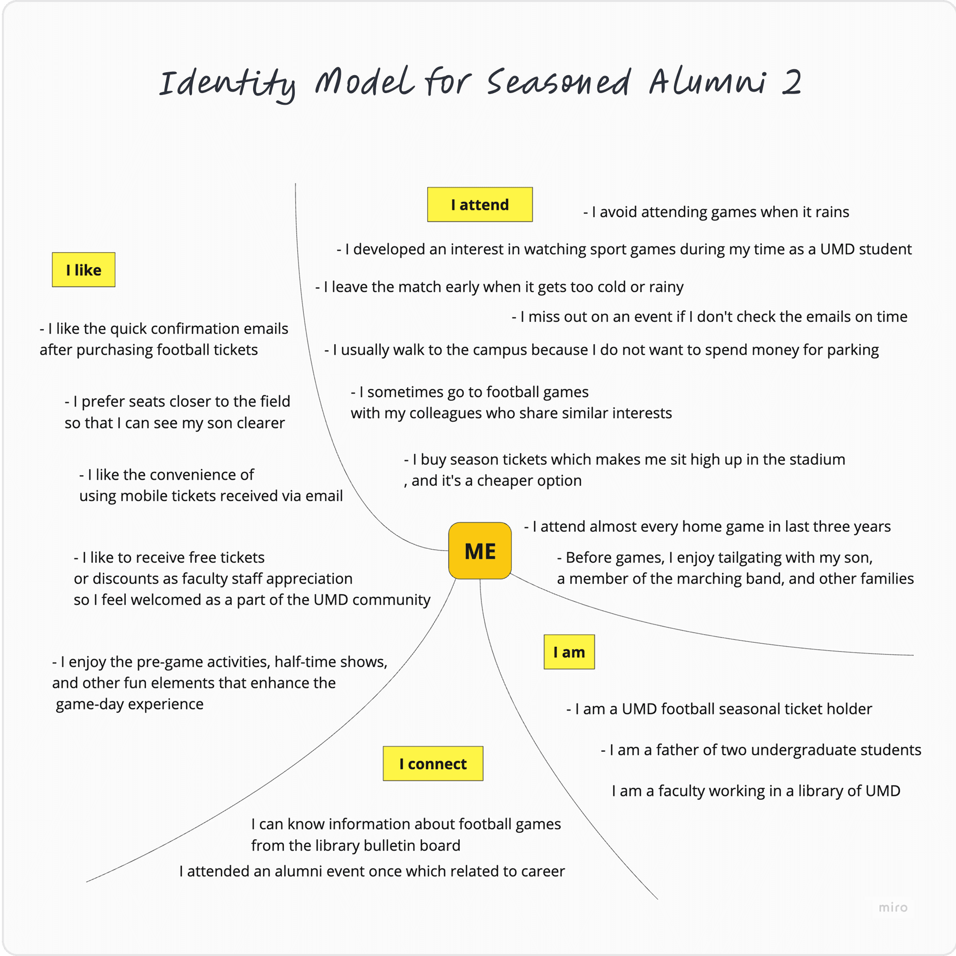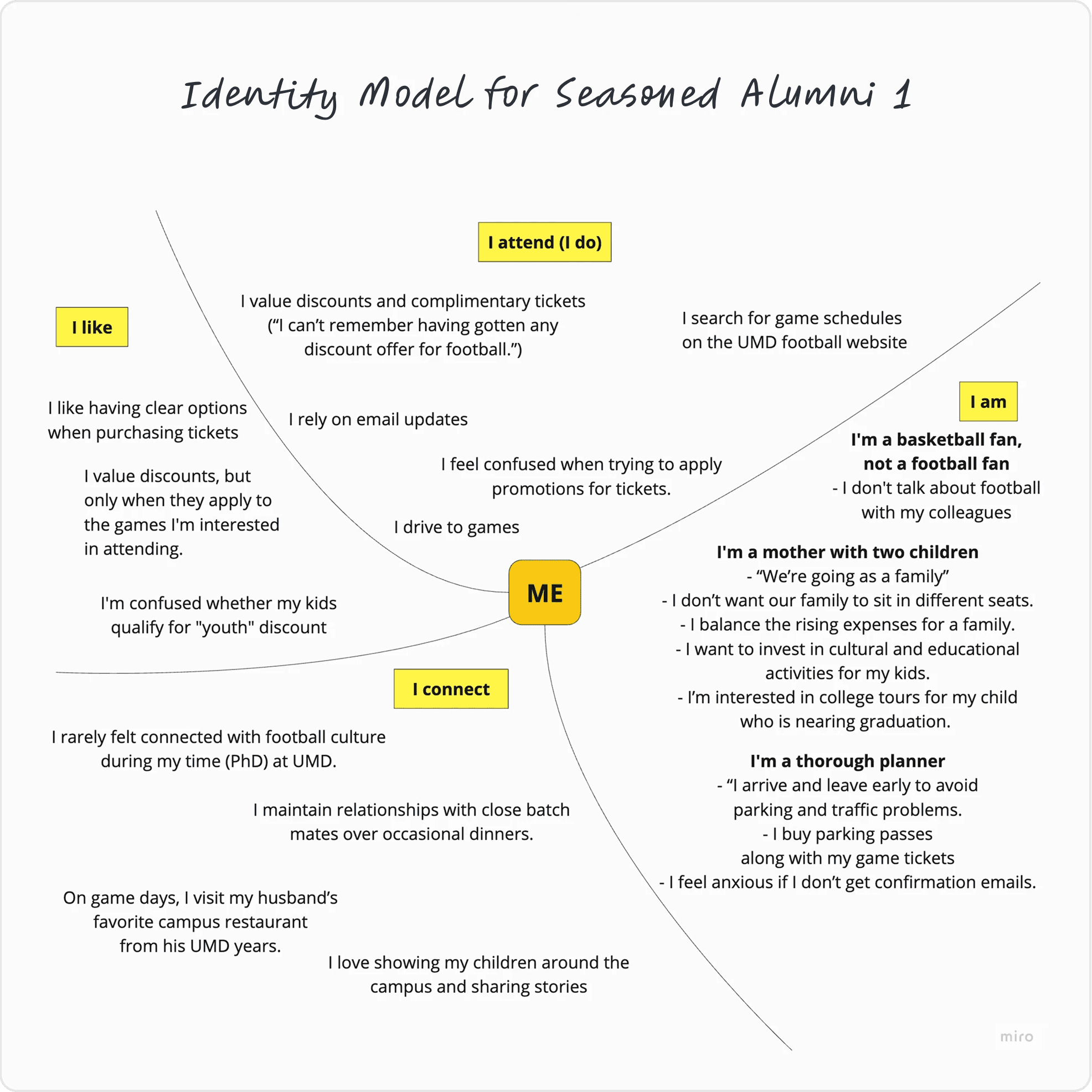 Based on contextual interviews with alumni and alumni coordinators, as well as surveys across alumni from various graduation years, our research revealed key insights into UMD alumni’s experiences attending football games. Our findings also provide transferable insights into broader needs, goals, and barriers of alumni, which we gained by exploring comprehensive alumni experiences beyond sporting events.