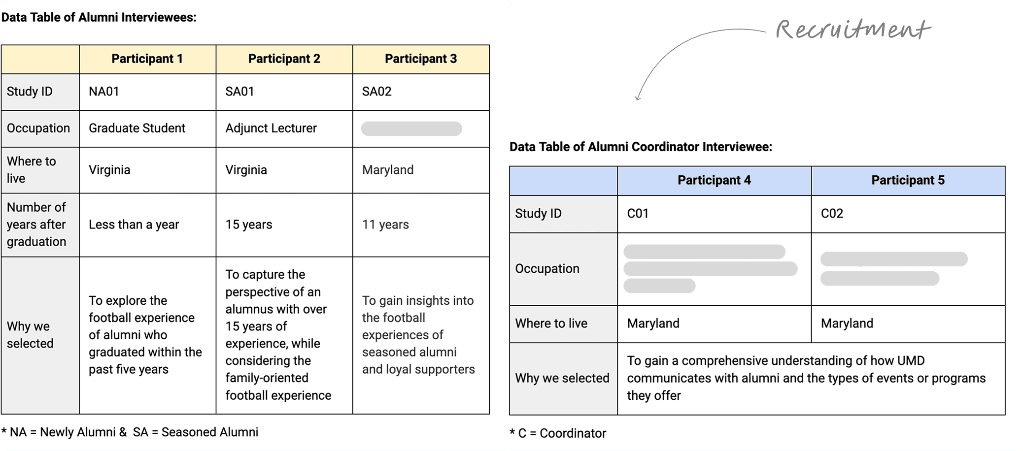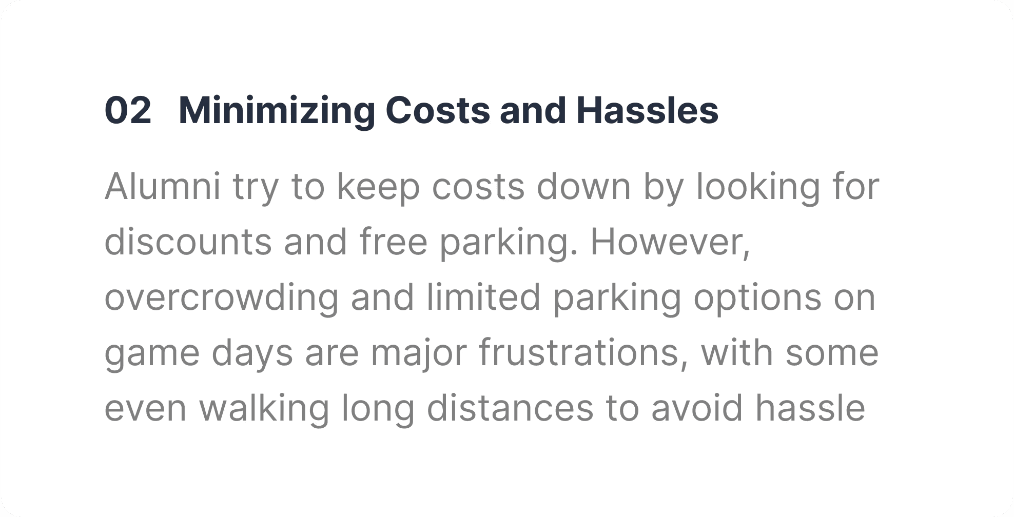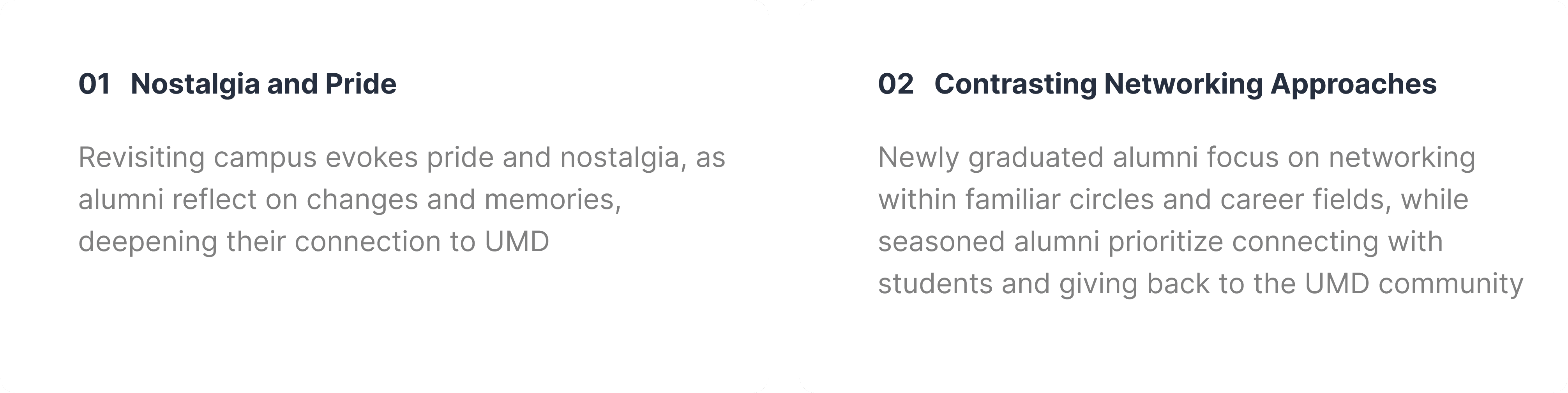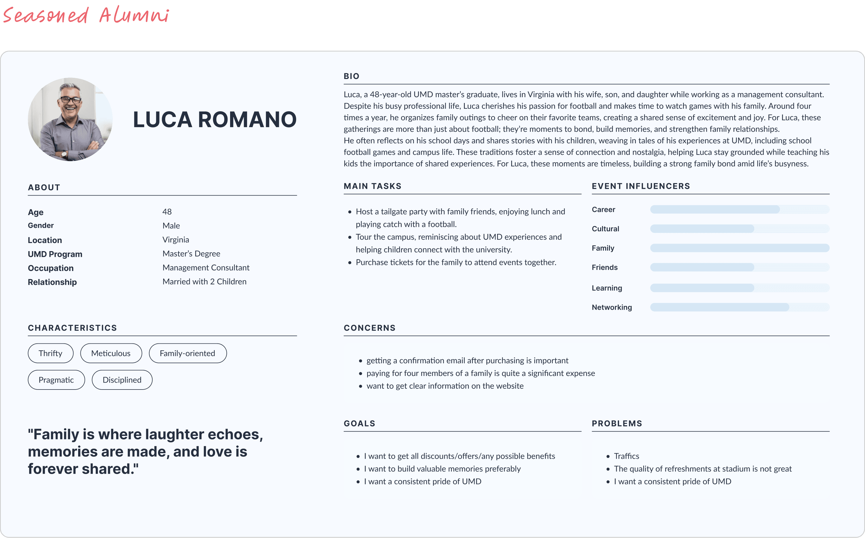 Based on contextual interviews with alumni and alumni coordinators, as well as surveys across alumni from various graduation years, our research revealed key insights into UMD alumni’s experiences attending football games. Our findings also provide transferable insights into broader needs, goals, and barriers of alumni, which we gained by exploring comprehensive alumni experiences beyond sporting events.