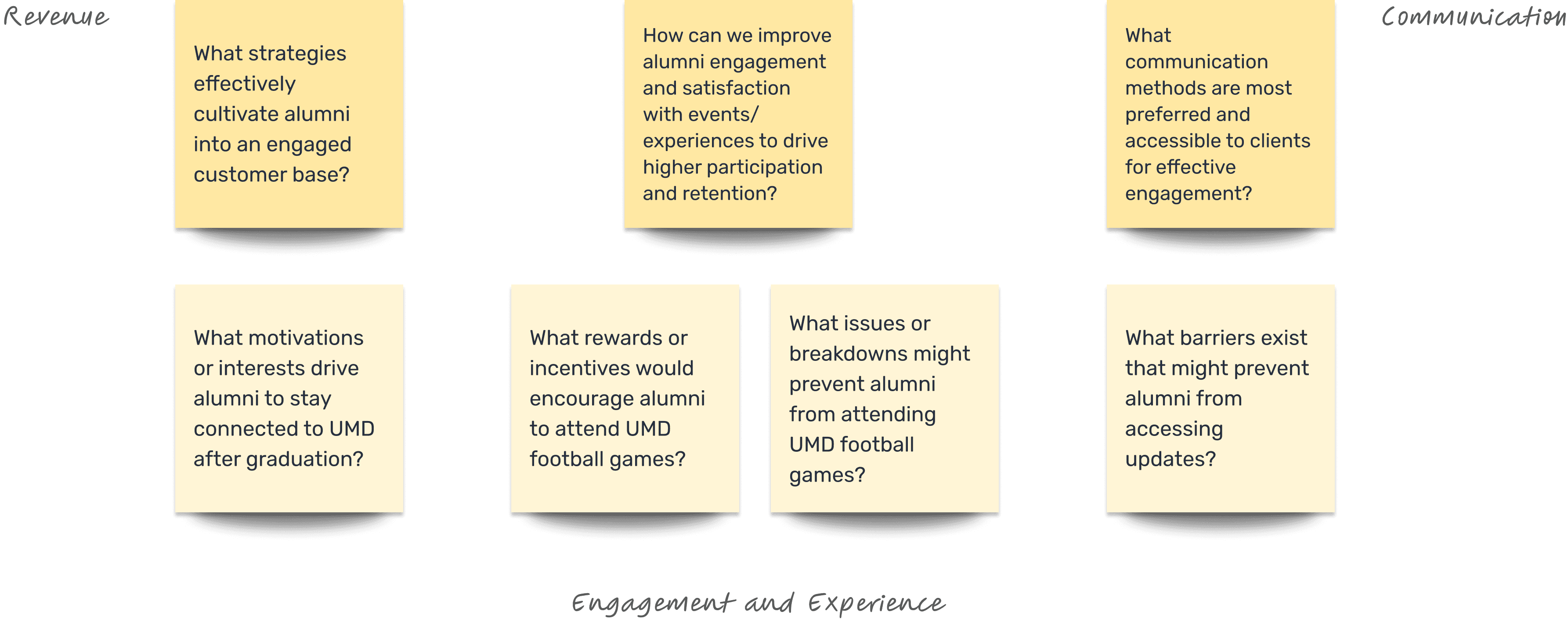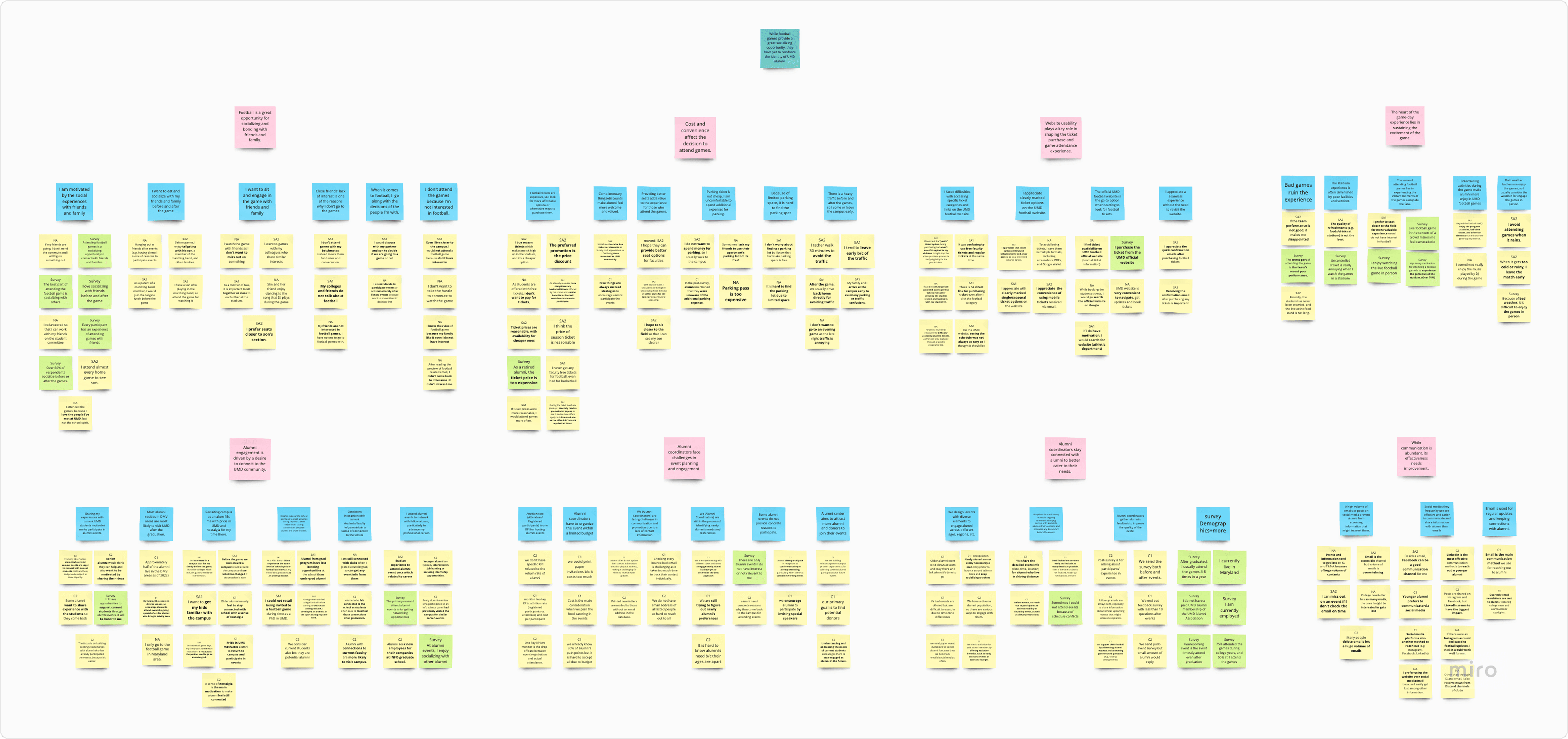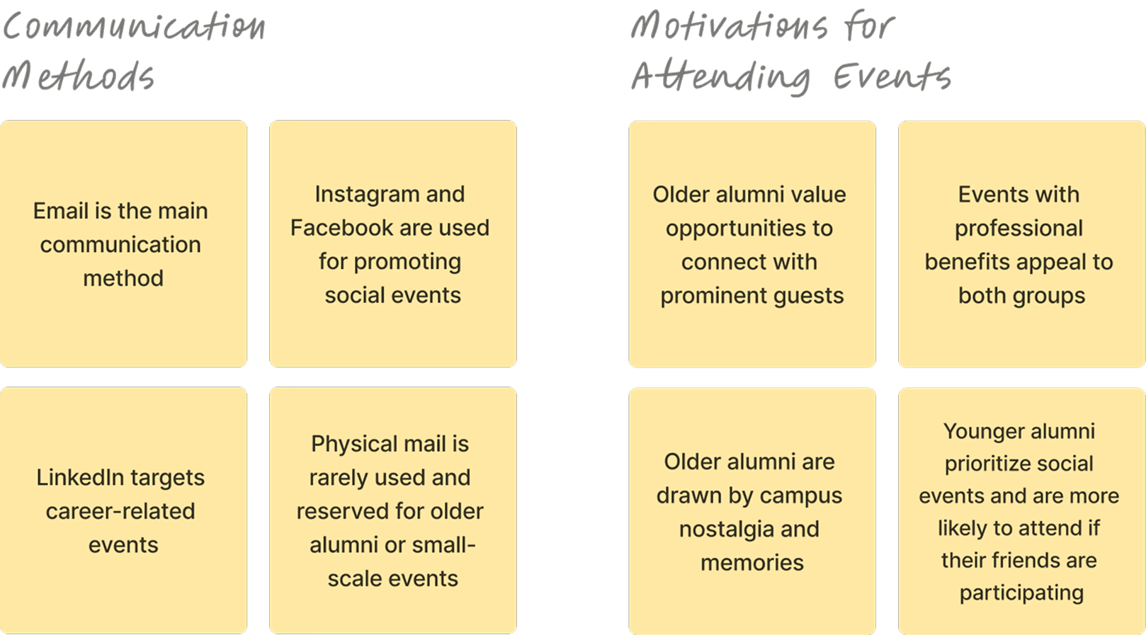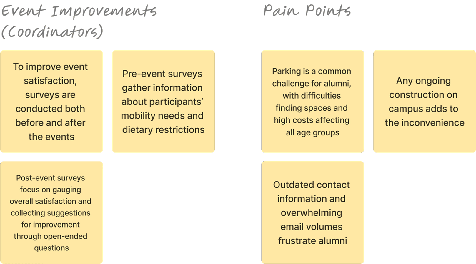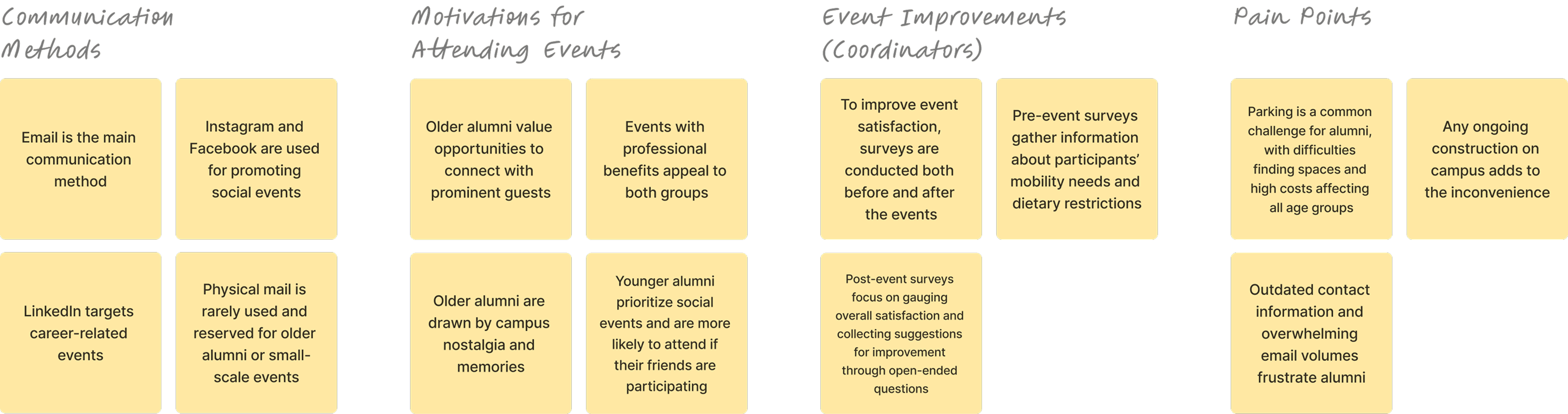 We identified eight categories: four on football experiences and four on promoting alumni identity. Findings showed football games are valued for social connections but fall short in reinforcing alumni identity, which remains an underutilized driver for deeper engagement. These insights guided our focus on communication, motivations, and strengthening alumni identity.