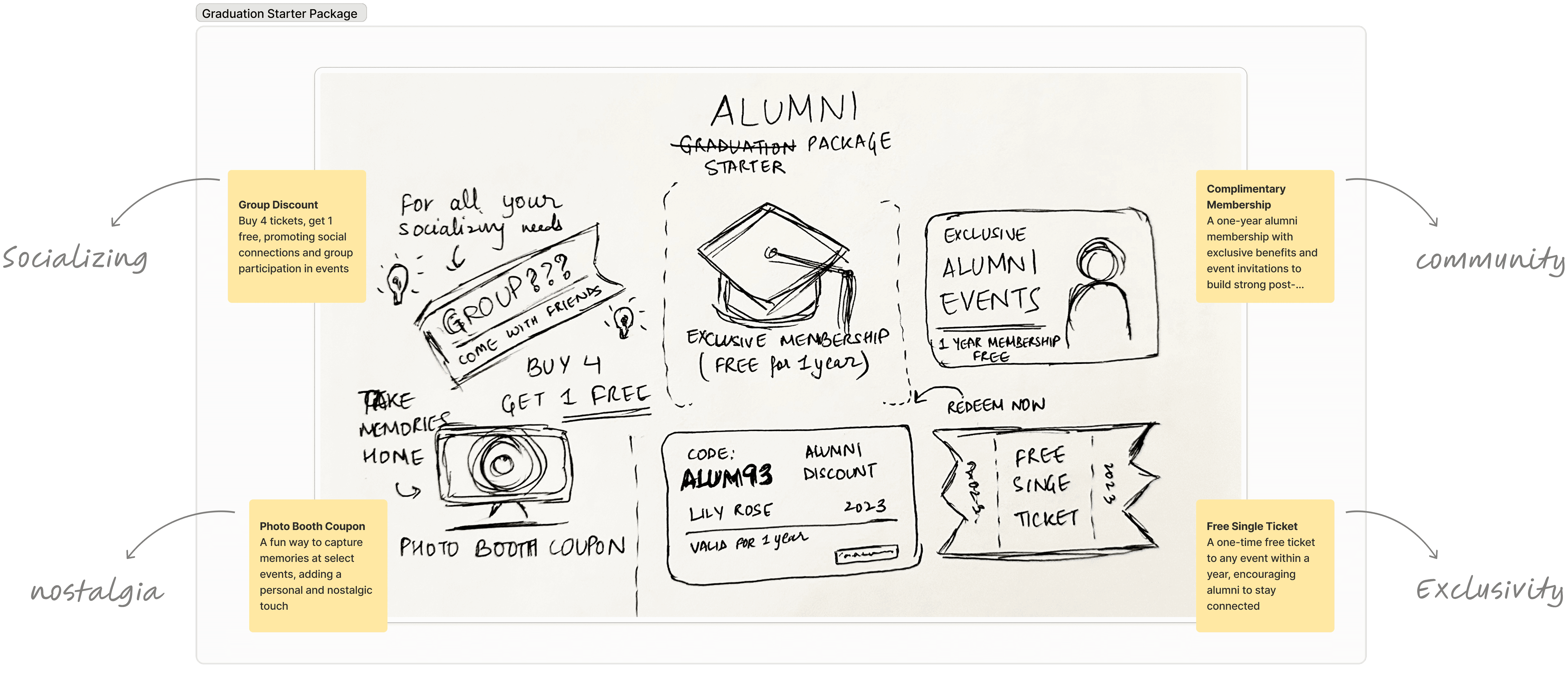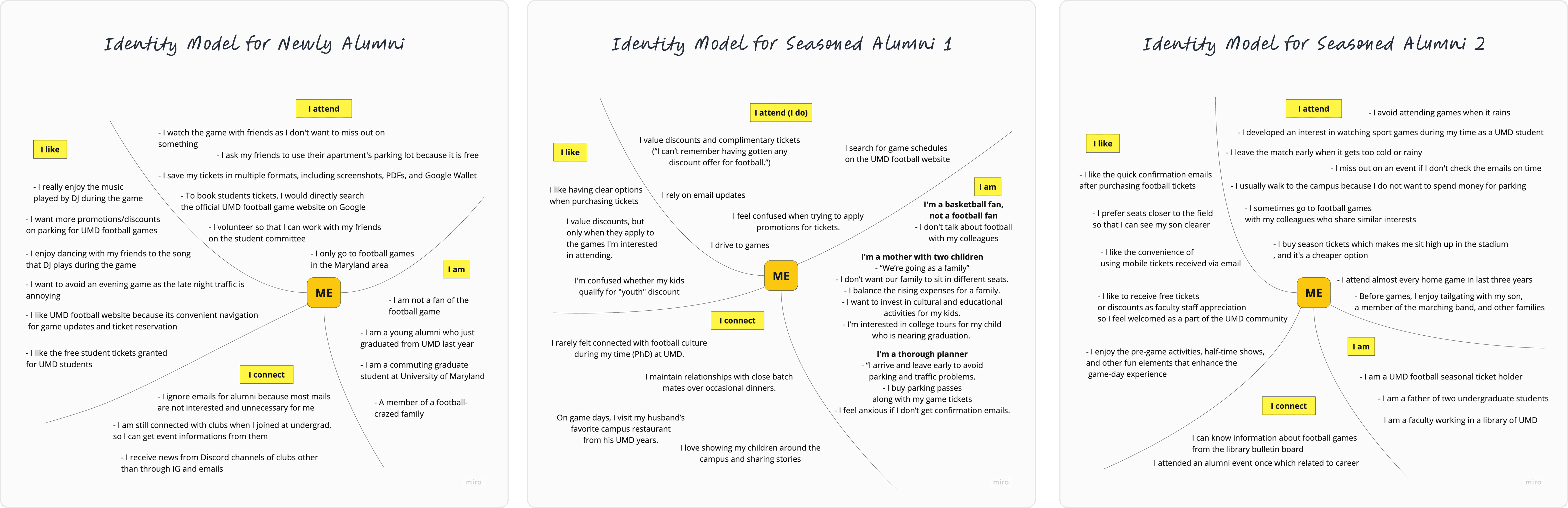 Drawing on our extensive research—interviews, surveys, and synthesized findings such as affinity diagrams, identity models, and personas, we explored UMD alumni's football experiences and engagement. By addressing the diverse needs and goals associated with the various identities alumni bring to their involvement in football games, we developed a product concept designed to strengthen their connection to the games. The image below illustrates the visions we created.
