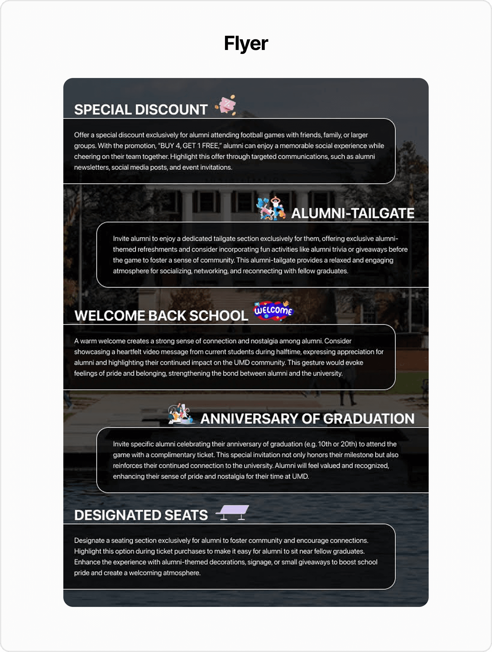 Our findings indicate that fostering a strong and consistent UMD identity among alumni, along with offering exclusive opportunities and incentives, significantly enhances engagement in football games. In response, we have designed a new event, "Alumni Day," where alumni are recognized as special guests, placing them at the heart of the game-day experience, with these following offerings: