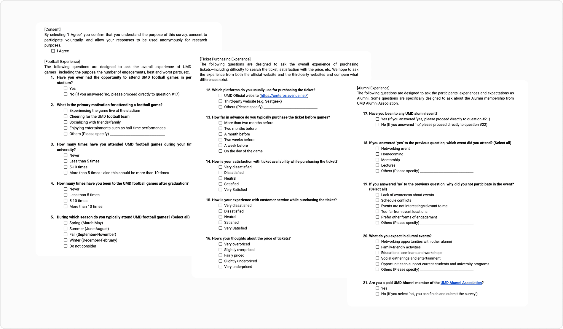We conducted a survey with 15 participants, featuring 22 questions in multiple-choice, rating-scale, and open-ended formats. The survey explored football experiences, ticket purchasing, alumni engagement, and demographic details