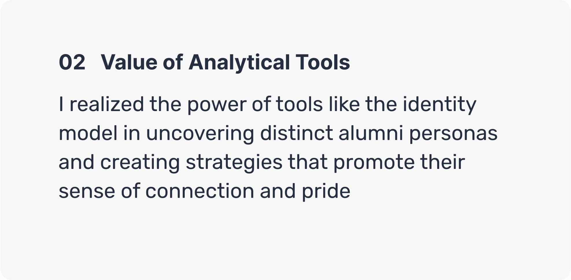 Our research highlights the importance of cultivating a strong and lasting UMD identity among alumni, particularly by offering meaningful opportunities and exclusive incentives to encourage their participation in university events. This understanding led to the creation of the Alumni Starter Package, designed to foster early engagement among recent graduates.