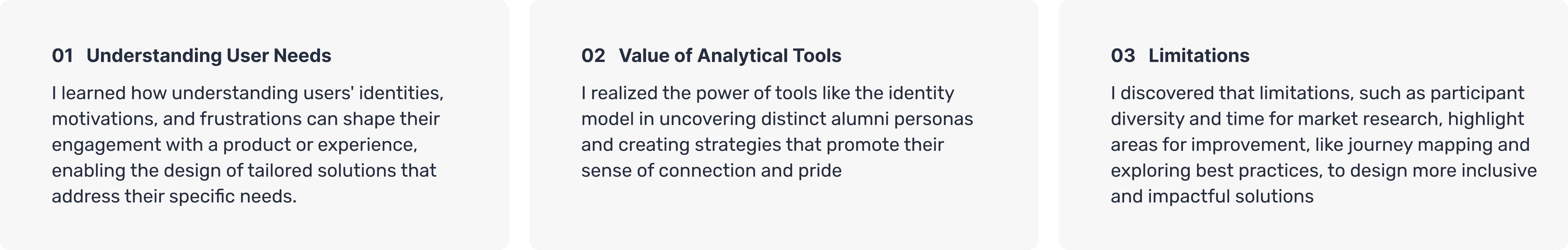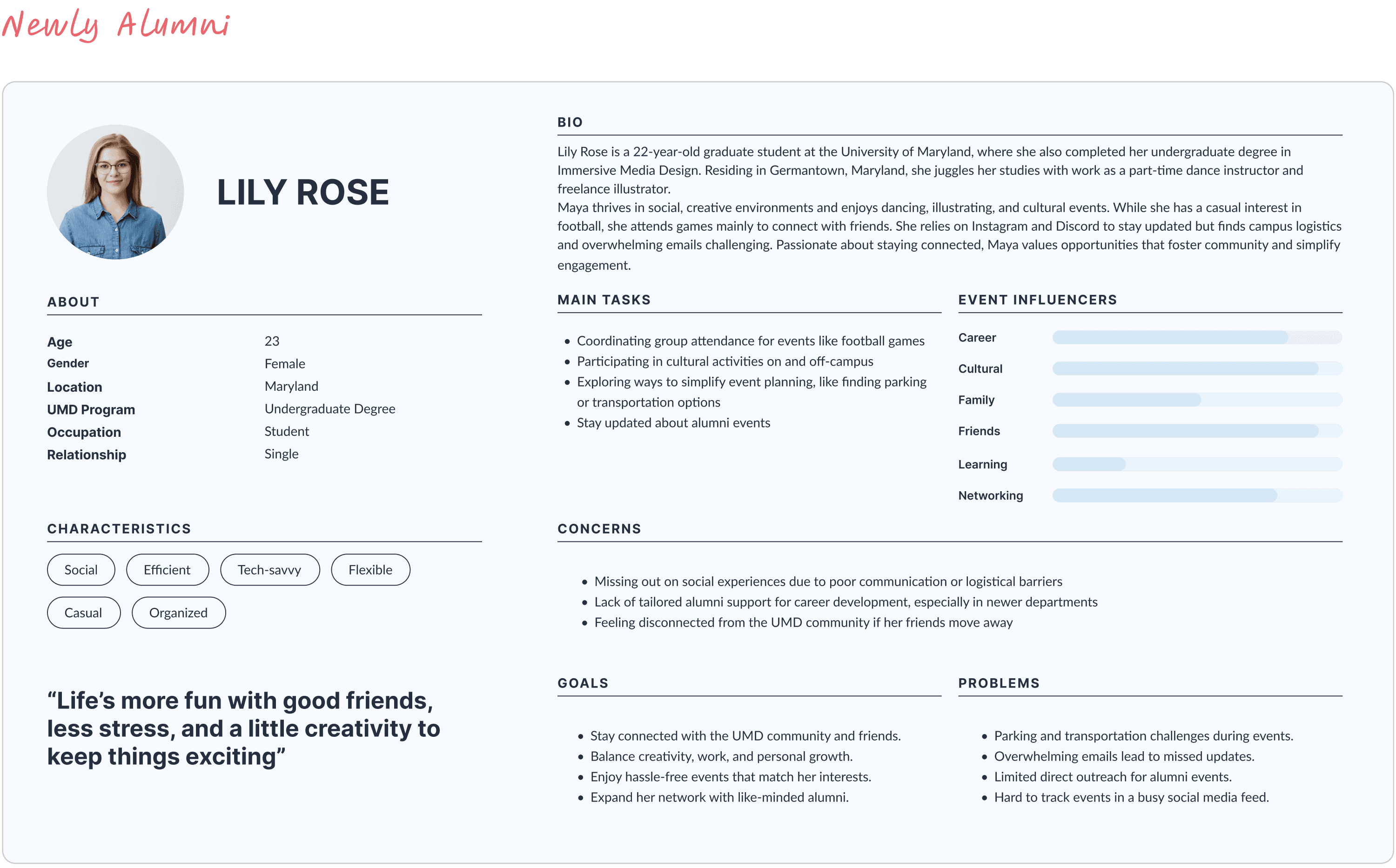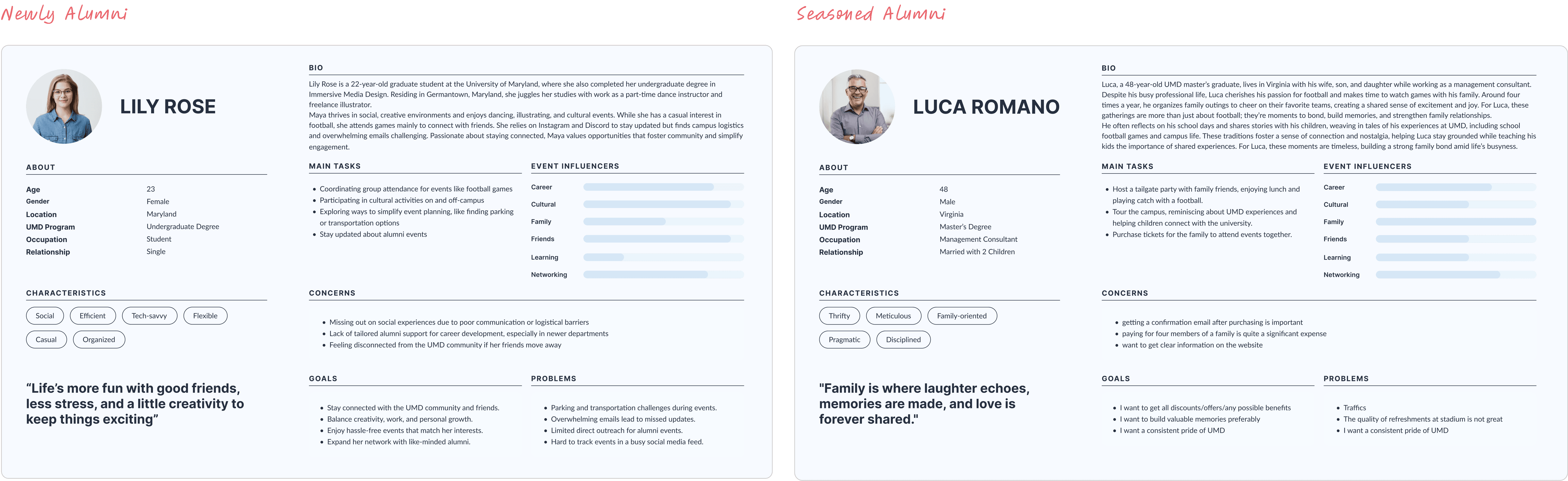 From alumni interviews, we created two personas: Newly Graduated Alumni and Seasoned Alumni, highlighting unique needs and motivations to design tailored strategies